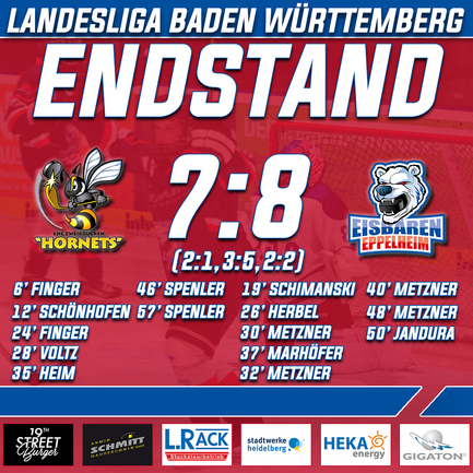 In einer offensiv geführten Partie zeigten unsere LL-Eisbären mehrfach Moral, konterten die stetigen Rückschläge, durch die sie mehrfach mit bis zu zwei Toren in Rückstand gerieten, um am Ende mit einem 8:7-Erfolg siegreich das Eis zu verlassen. Dabei konnten Marius Metzner mit vier Treffern, sowie Patrick Marhöfer, Kevin Herbel, Fabian Jandura und Tom Schimanski für die Eisbären einnetzen.
