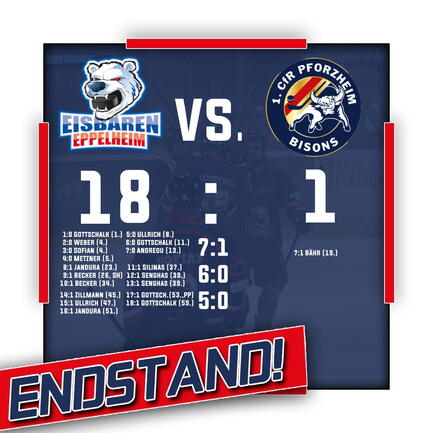Mit einer konstant starken Leistung über die gesamte Spielzeit konnten die Eisbären im Duell gegen chancenlose Bisons aus Pforzheim den vierten Heimsieg in Serie einfahren. Die Tore von Kapitän Roman Gottschalk (4), Maurice Ullrich (2), Fabian Jandura (2), Elias Becker (2), Neuzugang Can-Luca Senghas (2), Max Weber, Udo Sofian, Marius Metzner, Dominic Andreou, Avgustinas Silinas und Dennis Zillmann führten zu einem klaren und in der Höhe absolut verdienten 18:1-Kantersieg, der zudem den höchsten bisherigen Liga-Sieg darstellt.