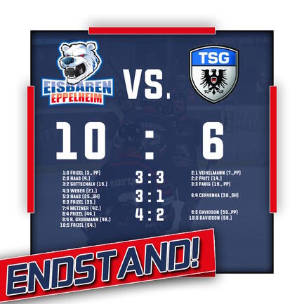 Im nächsten Topspiel konnten die Eisbären ihre weiße Heim-Weste verteidigen und auch den Tabellendritten nach Toren von Frizel (4), Haas (2), Gottschalk, Weber, Metzner und R. Großmann mit 10:6 bezwingen. Damit konnte man die TSG tabellarisch nicht nur distanzieren, sondern auch die Tabellenführung für weitere 48 Stunden verteideigen, eher die Fire Wings ihr Nachholspiel bestreiten.