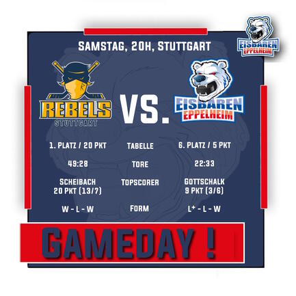 Zum Auftakt der Rückrunde gastieren die Eisbären am Samstag bei den Stuttgart Rebels, die erneut als Tabellenführer auf die Eisbären treffen. Im Hinspiel musste man erst spät den Ausgleich und die folgende Penalty-Niederlage hinnehmen, im Rückspiel will man es ähnlich spannend gestalten. Doch die Rebels werden gewarnt sein, und mit der Empfehlung einer 100% Heimquote in der Hauptrunde mit Rückenwind gegen die Eisbären antreten. Doch die Eisbären konnten zuletzt vor allem gegen die Top-Teams überzeugen, jedoch fehlte immer ein kleines Quäntchen, was sich am Samstag gerne ändern darf.